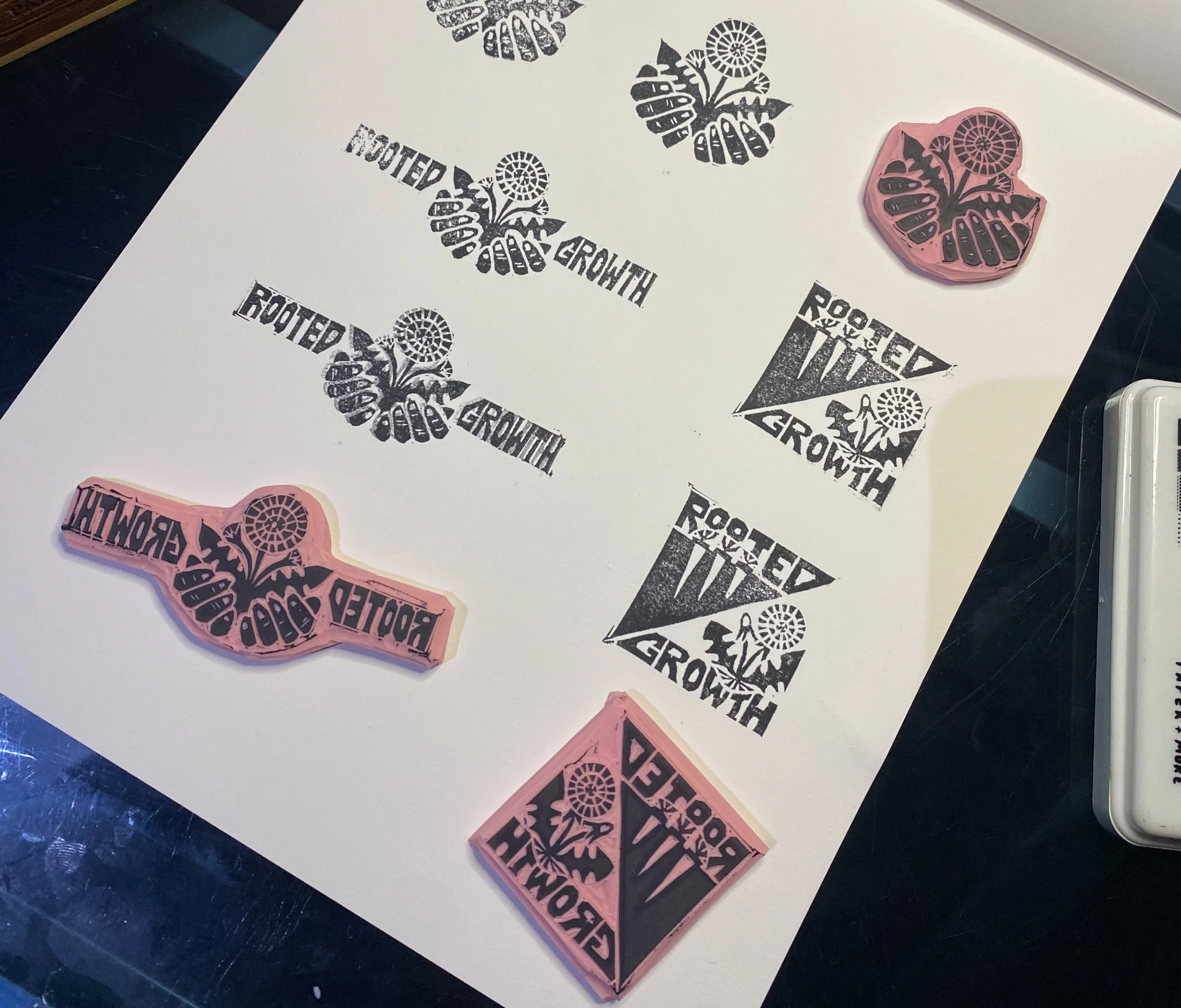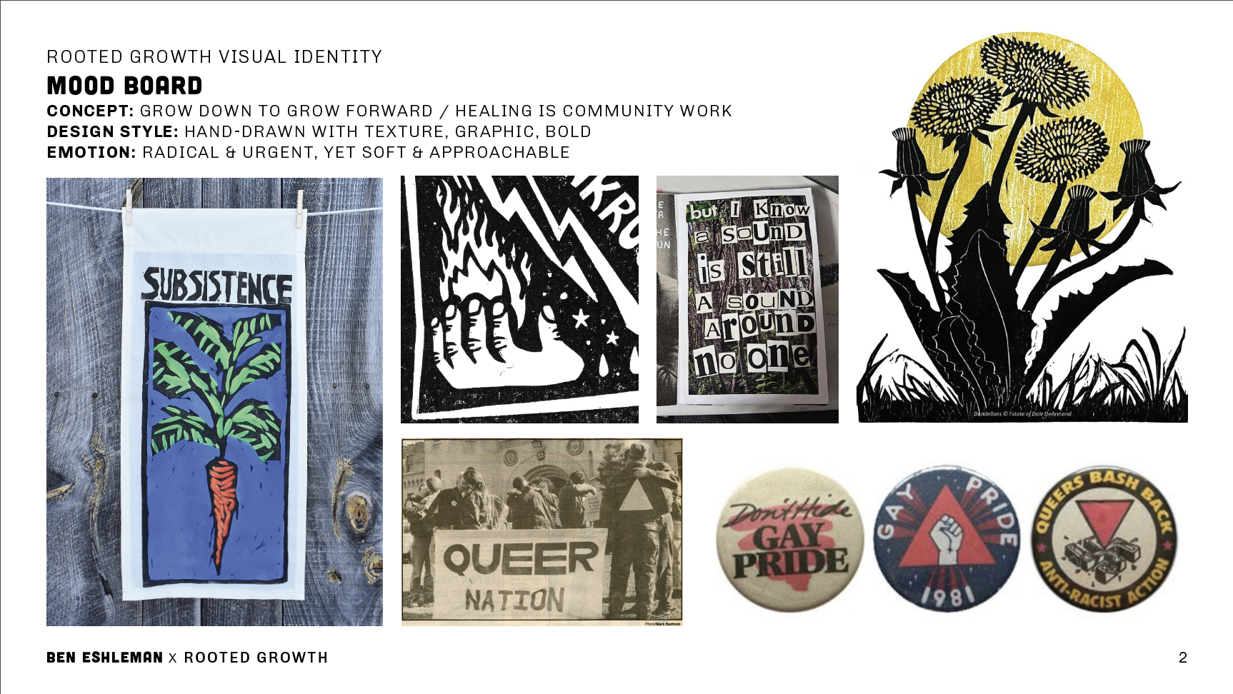 When I got to work, I pulled inspiration from sources rooted in collective creation and resistance, like Bread + Puppet Press, 80s and 90s queer activism, handmade protest graphics, zines, and community signage. I didn’t use these references as a way to copy other work, but as a way to cultivate meaning. The references shared a DIY spirit that was intentional, expressive, and deeply human. Exactly what Rooted Growth needed to feel radical and yet approachable.