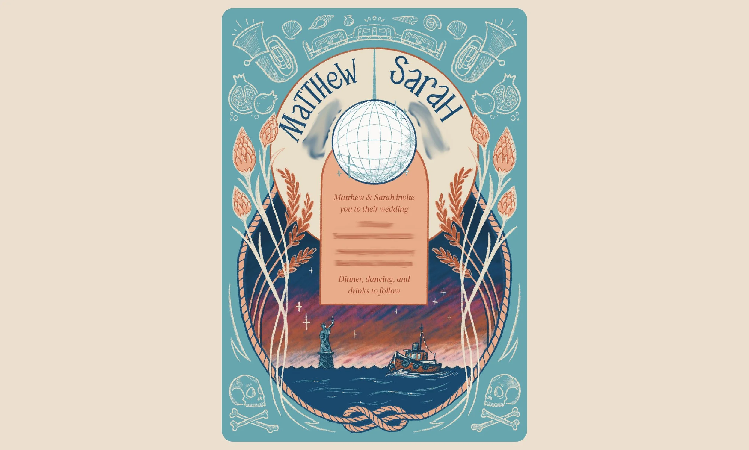 This custom wedding invitation was designed for Matthew & Sarah. The clients wanted a design that incorporated all of their favorite things, their chosen color palette, and nods to the wedding location.