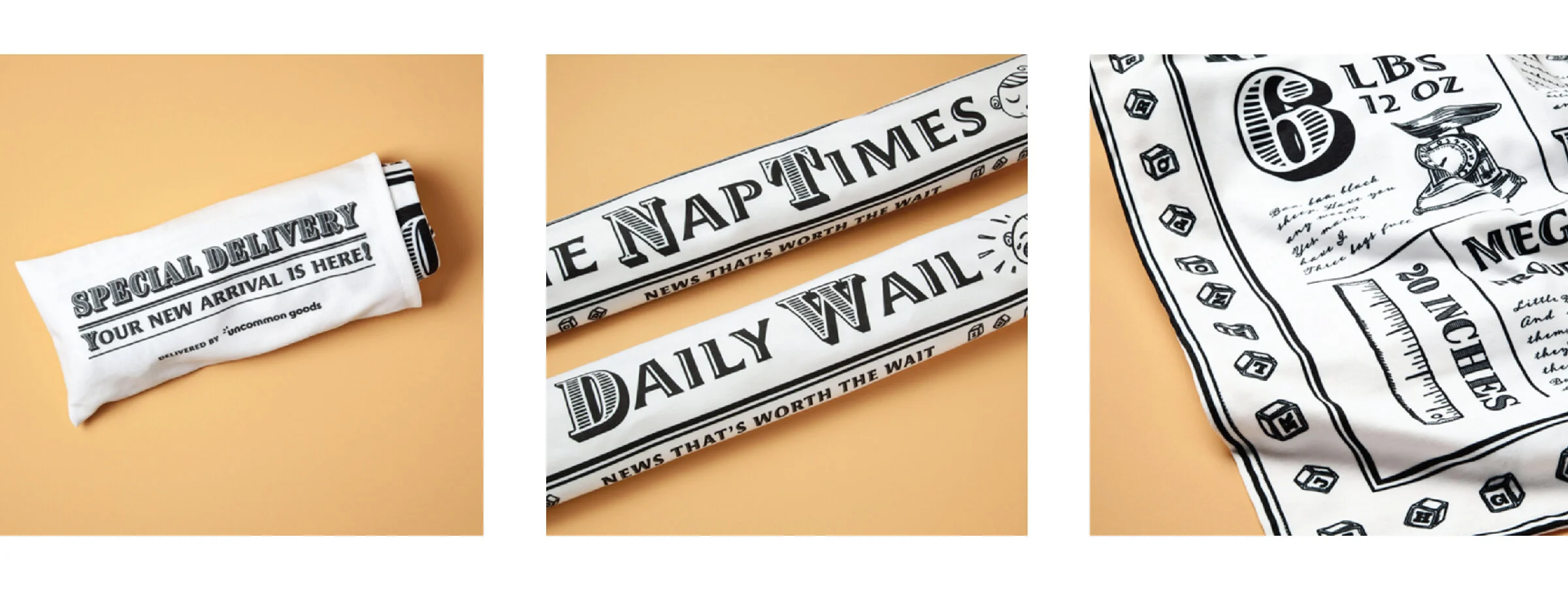 In 2020, I created a personalized birth announcement baby swaddle for Uncommon Goods. The design was inspired by whimsical and playful vintage newspapers, with bold text and woodcut-style illustrations. The text can be customized to match a newborn’s information, and as a special detail, the “articles” are bedtime stories from Aesop’s Fables and other childhood classics. This gift set quickly became a best-seller in the new baby category.